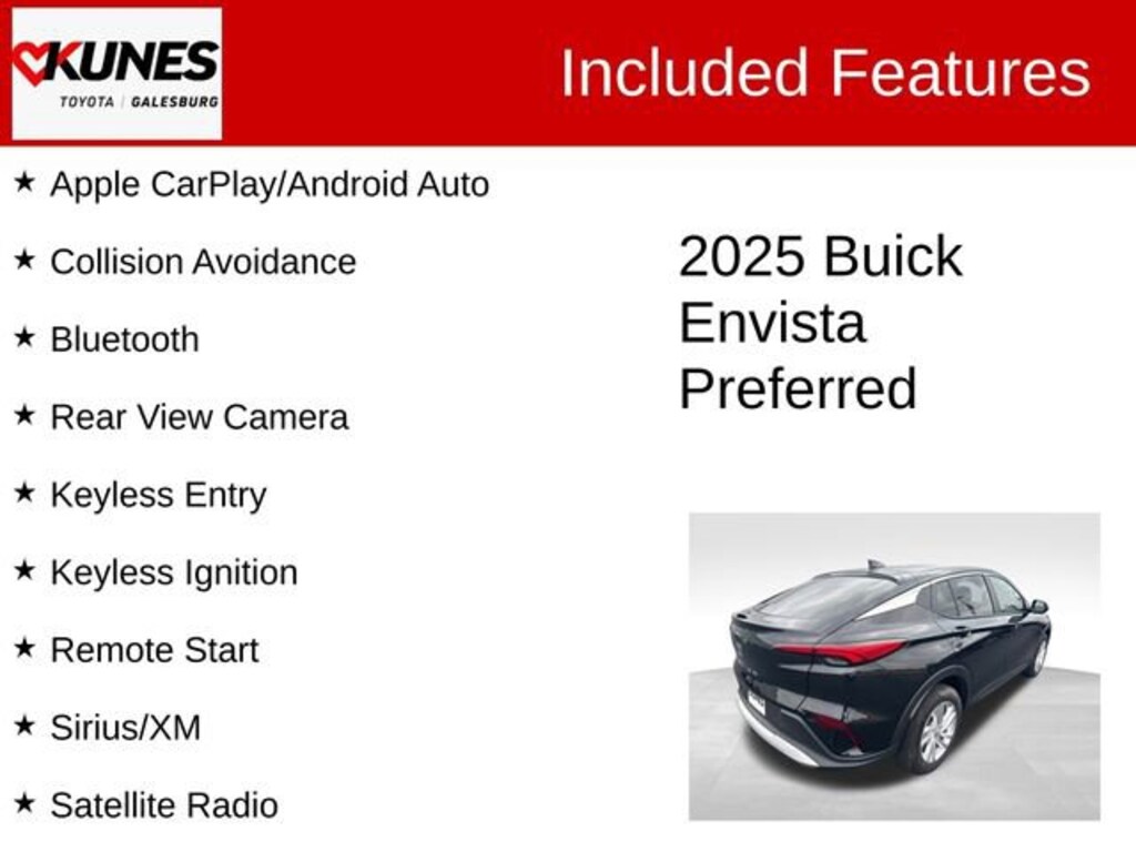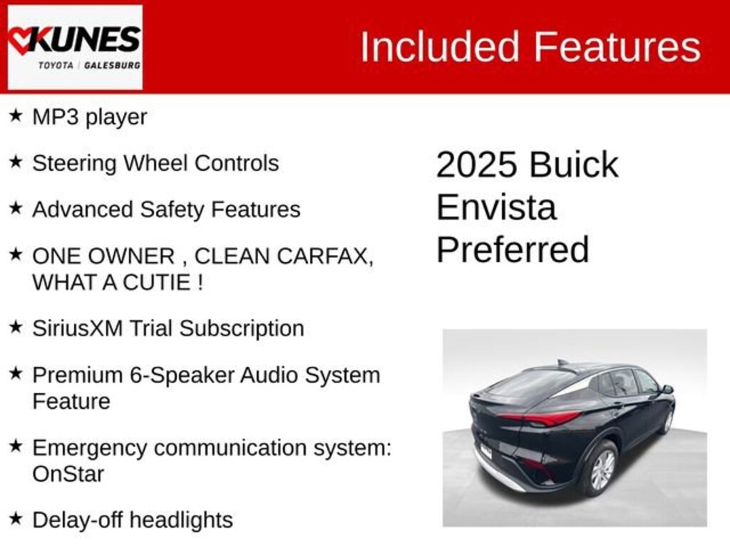 2025 Buick Envista Preferred Ebony Twilight Metallic Recent Arrival! CARFAX One-Owner. Clean CARFAX. Apple CarPlay/Android Auto, Collision Avoidance, Bluetooth, Rear View Camera, Keyless Entry, Keyless Ignition, Remote Start, Sirius/XM, Satellite Radio, MP3 player, Steering Wheel Controls, Advanced Safety Features, ONE OWNER , CLEAN CARFAX, WHAT A CUTIE !, Delay-off headlights, Emergency communication system: OnStar, Premium 6-Speaker Audio System Feature, SiriusXM Trial Subscription.