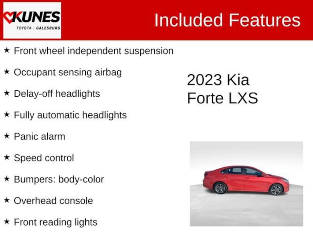 2023 Kia Forte LXS Currant Red Recent Arrival! CARFAX One-Owner. Apple CarPlay/Android Auto, Collision Avoidance, Bluetooth, Rear View Camera, Keyless Entry, MP3 player, Steering Wheel Controls, 16" x 6.5J Alloy Wheels, Bumpers: body-color, Delay-off headlights, Front reading lights, Front wheel independent suspension, Fully automatic headlights, Occupant sensing airbag, Outside temperature display, Overhead airbag, Overhead console, Panic alarm, Radio: 8" Display Audio, Speed control, Split folding rear seat, Telescoping steering wheel, Tilt steering wheel, Variably intermittent wipers.