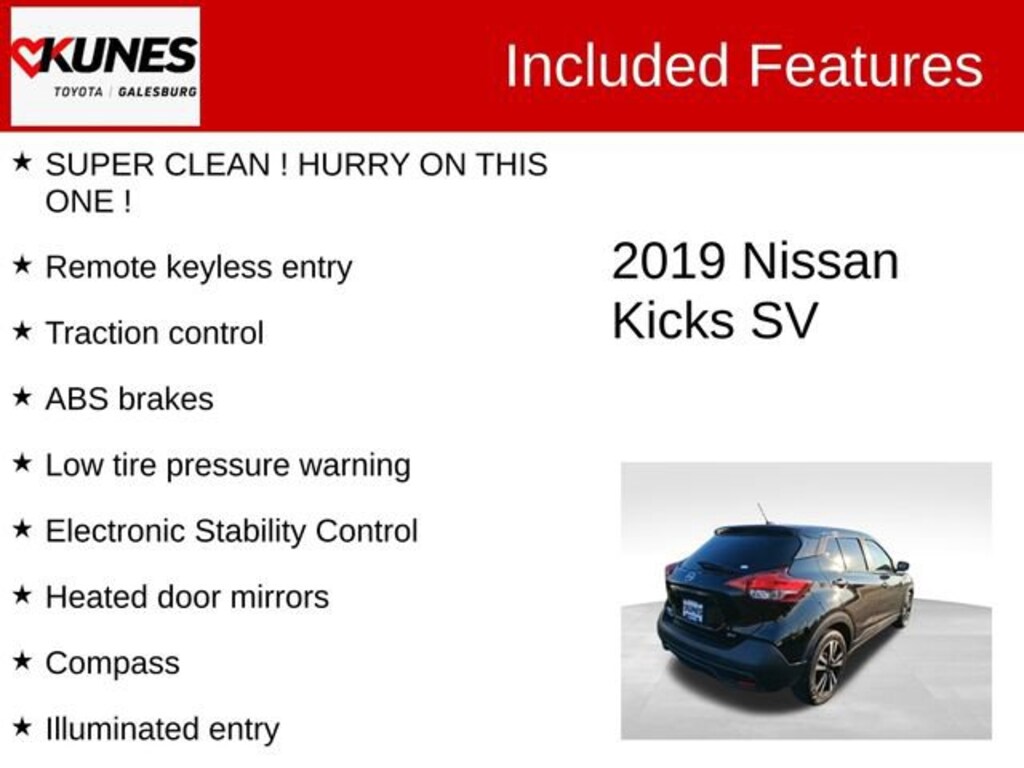 2019 Nissan Kicks SV Super Black Recent Arrival! Bluetooth, Rear View Camera, Non Smoker, Local Trade, Keyless Entry, Sirius/XM, Satellite Radio, Steering Wheel Controls, Advanced Safety Features, SUPER CLEAN ! HURRY ON THIS ONE !, ABS brakes, Alloy wheels, Compass, Electronic Stability Control, Heated door mirrors, Illuminated entry, Low tire pressure warning, Remote keyless entry, Traction control.