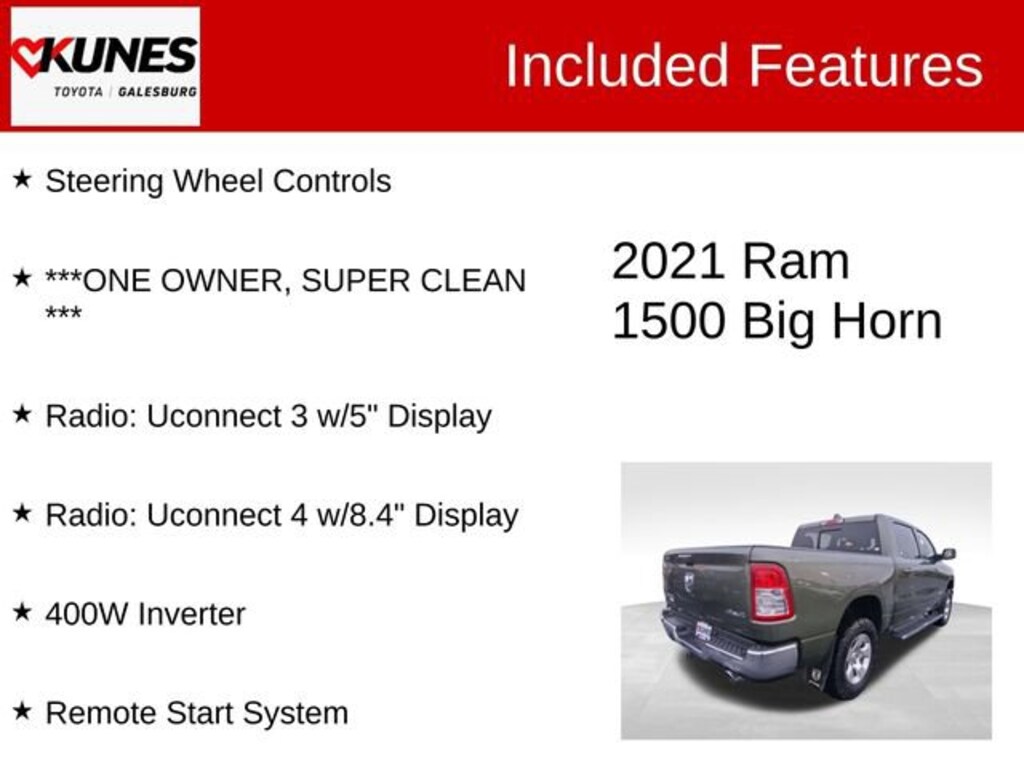 2021 Ram 1500 Big Horn/Lone Star Olive Green Pearlcoat Recent Arrival! CARFAX One-Owner. Collision Avoidance, Bluetooth, Rear View Camera, Non Smoker, Local Trade, Keyless Ignition, Satellite Radio, Running Boards, Tow Package, Steering Wheel Controls, ***ONE OWNER, SUPER CLEAN ***, 400W Inverter, Radio: Uconnect 3 w/5" Display, Radio: Uconnect 4 w/8.4" Display, Remote Start System.