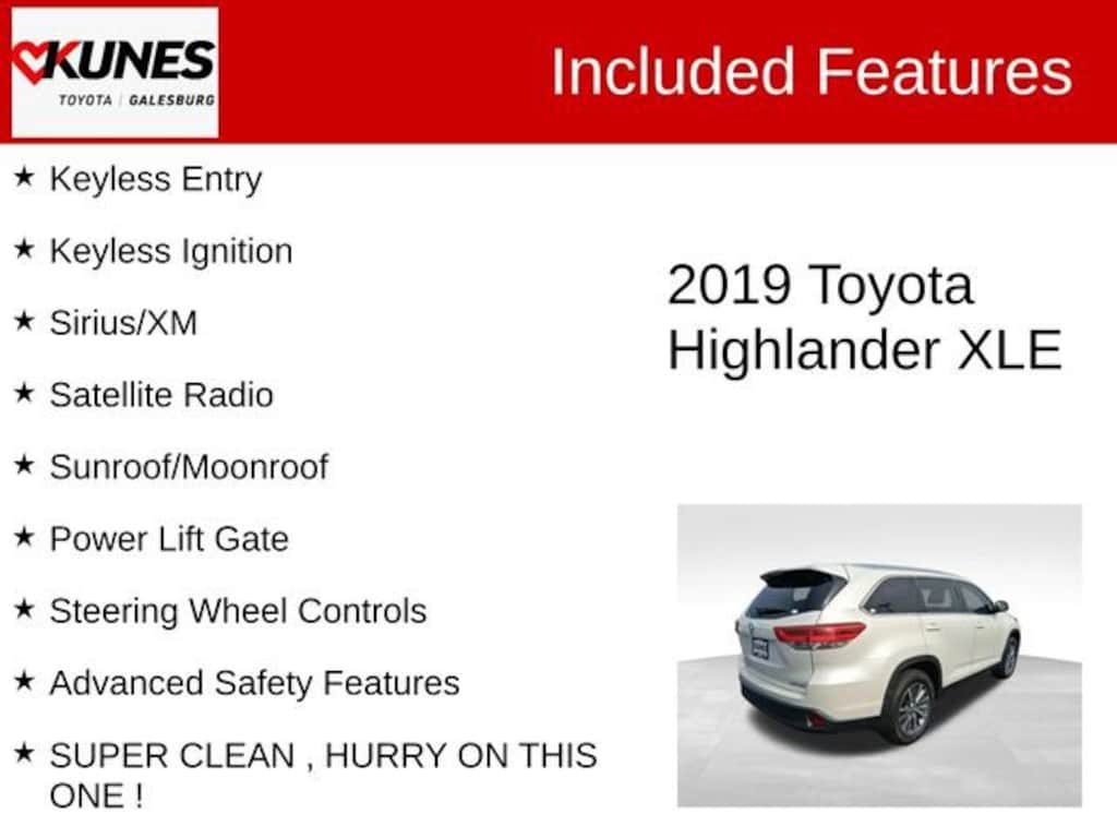 2019 Toyota Highlander XLE White Recent Arrival! Apple CarPlay/Android Auto, Collision Avoidance, Bluetooth, Rear View Camera, Non Smoker, Local Trade, Leather, Heated Seats, 3rd Row Seating, Keyless Entry, Keyless Ignition, Sirius/XM, Satellite Radio, Sunroof/Moonroof, Power Lift Gate, Steering Wheel Controls, Advanced Safety Features, SUPER CLEAN , HURRY ON THIS ONE !, AWD, ABS brakes, Active Cruise Control, Alloy wheels, Electronic Stability Control, Front dual zone A/C, Heated door mirrors, Heated Front Bucket Seats, Heated front seats, Illuminated entry, Leather Seat Trim, Low tire pressure warning, Navigation System, Power Liftgate, Power moonroof, Remote keyless entry, Traction control.